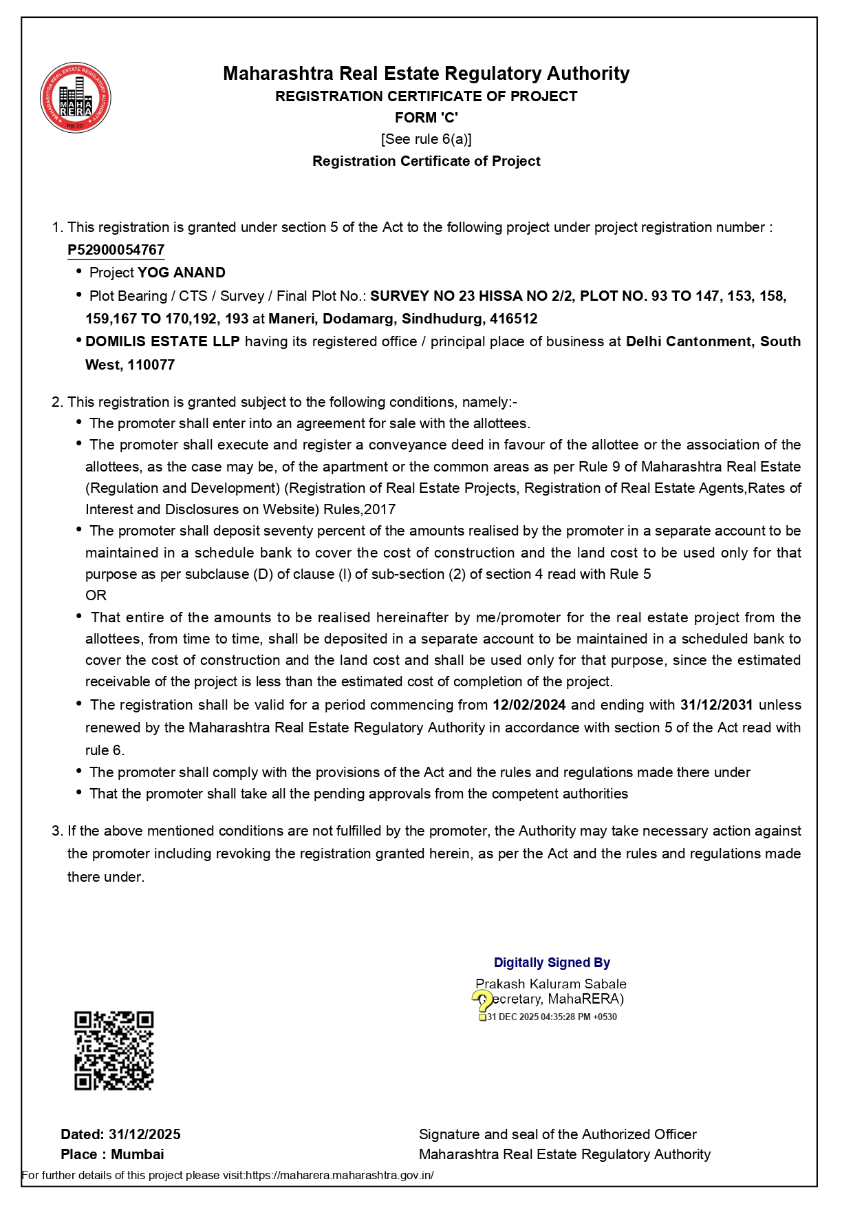 Yog Anand promises a blend of a serene lifestyle and strong appreciation potential. The community is designed as a secure, gated township and features premium amenities for modern living, including a club resort, swimming pool, gym, and dedicated yoga and sports zones. For buyer confidence, the project is officially RERA registered under MahaRERA, ensuring full transparency and compliance throughout the entire purchasing process.